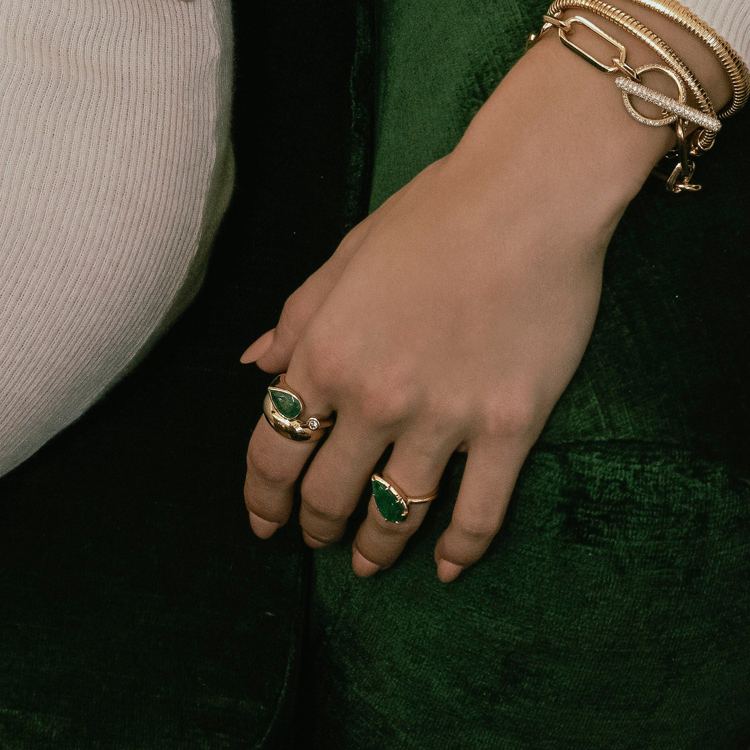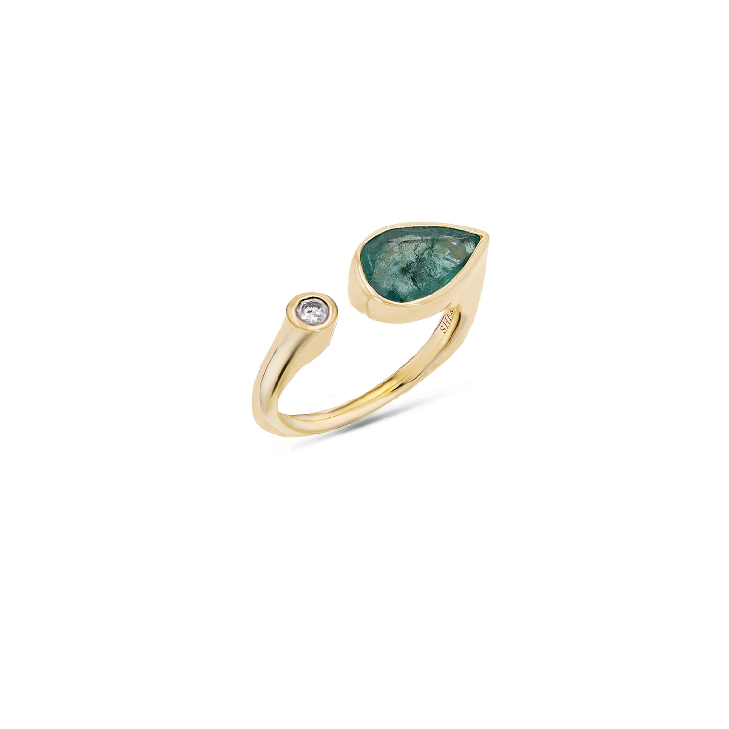 14k Teardrop Emerald and Diamond Bezel Two Stone Ring