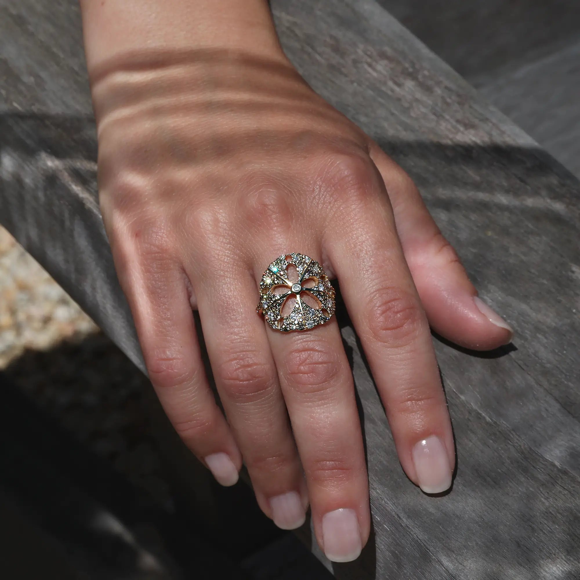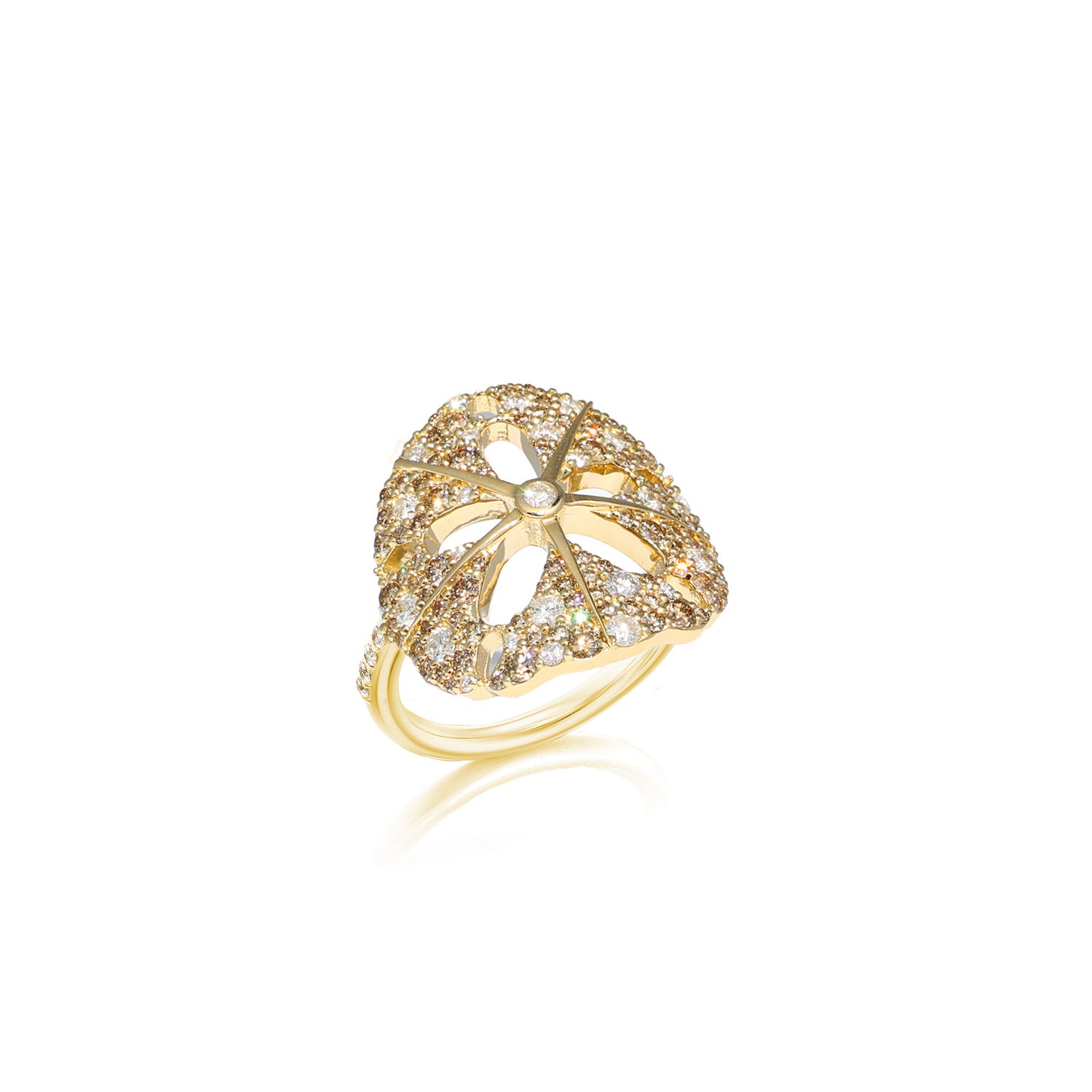 14k Sand Dollar Saddle Ring with Champagne & White Diamonds