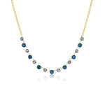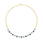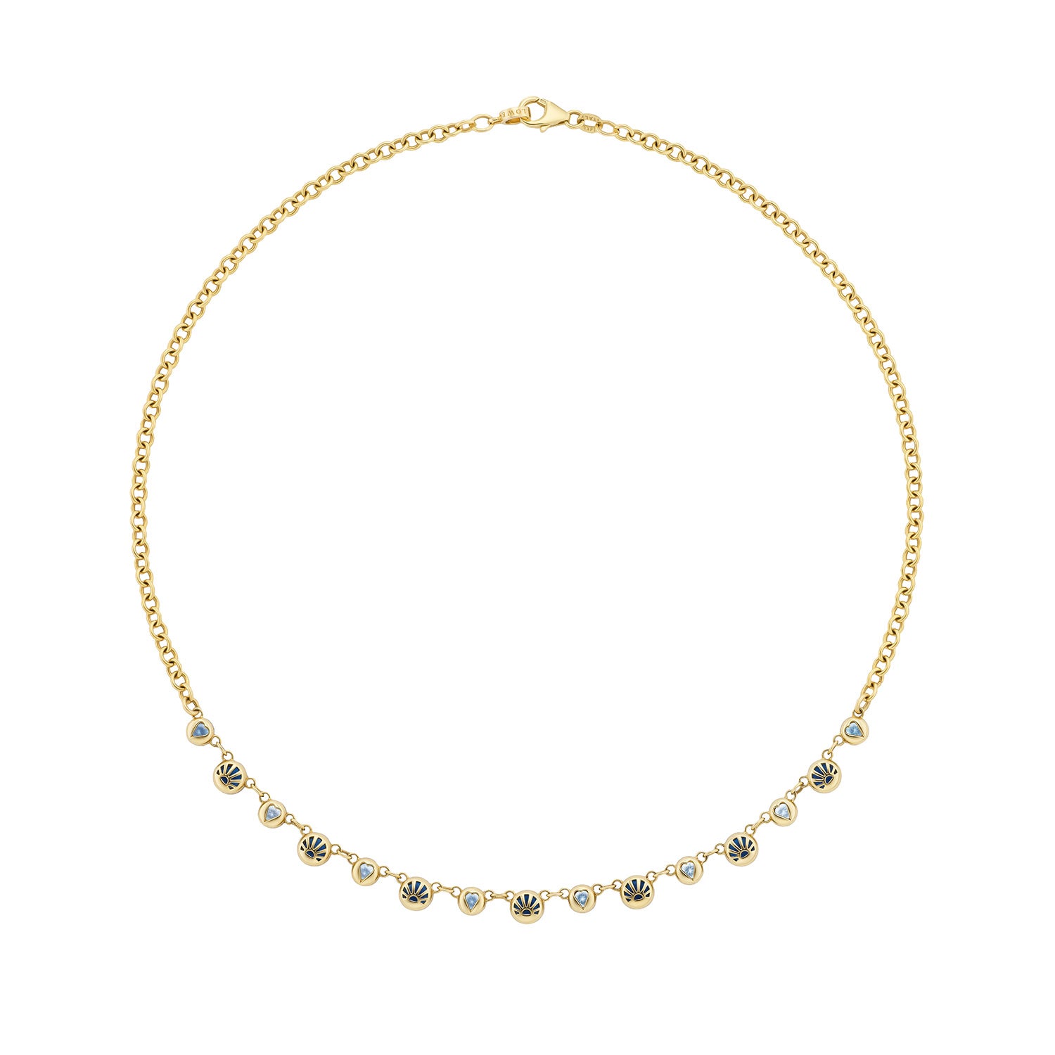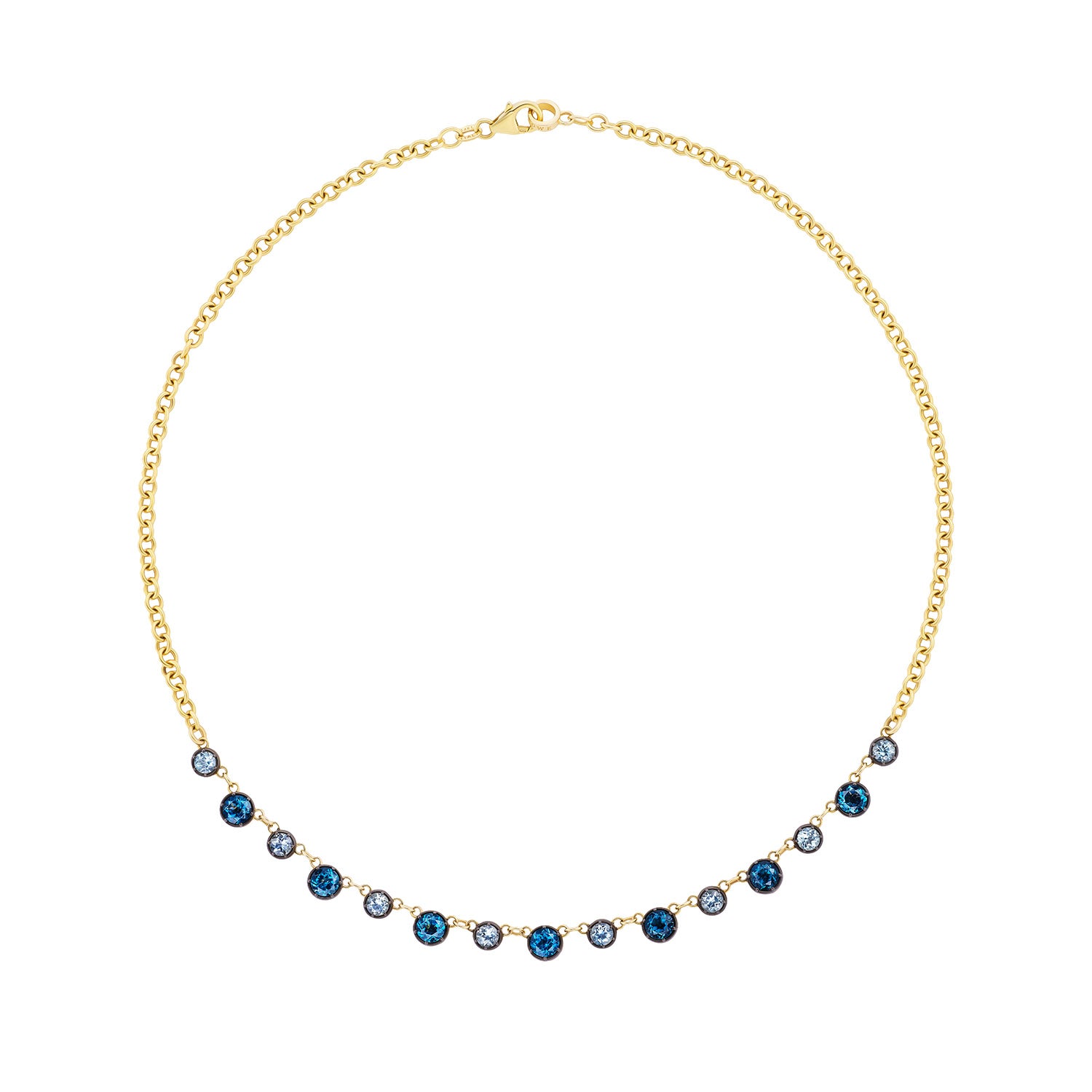 Combining cool-toned gemstones and a timeless, heirloom-quality design, this 18" necklace features aquamarine and London blue topaz stones bezel-set in 14k gold and black enamel for a sophisticated contrast. A 14k yellow gold cable chain and lobster clasp closure complete the necklace. Handmade in California. Style number: NG003149