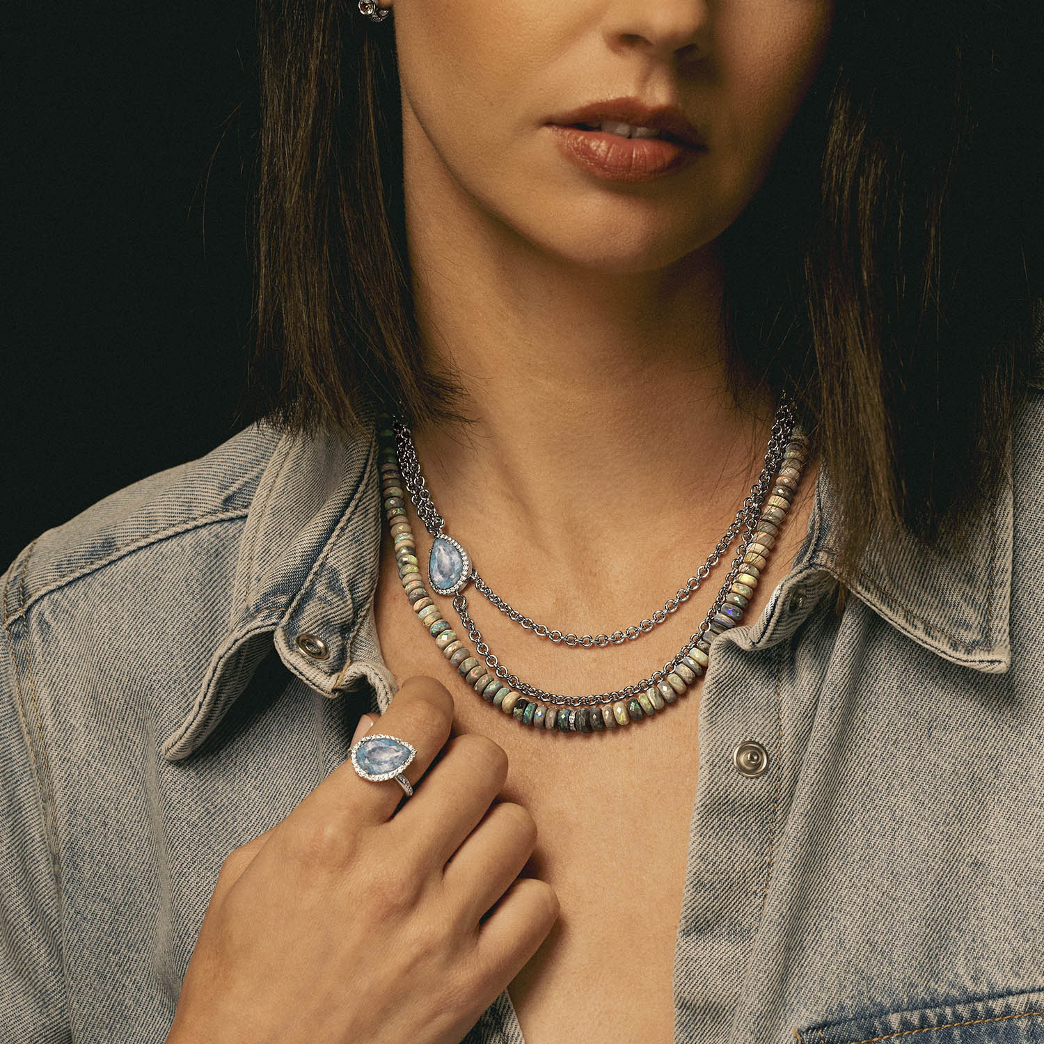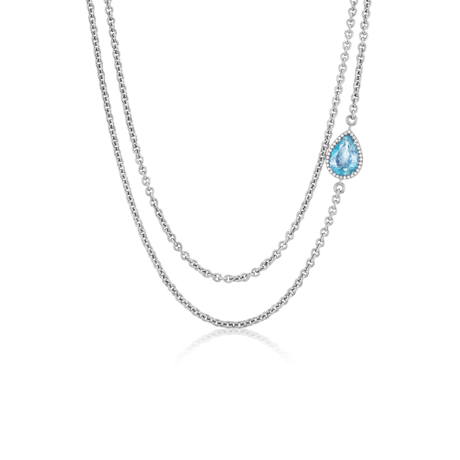 Pendentif en forme de larme en aigue-marine et diamant sur une chaîne double rang - 43 cm