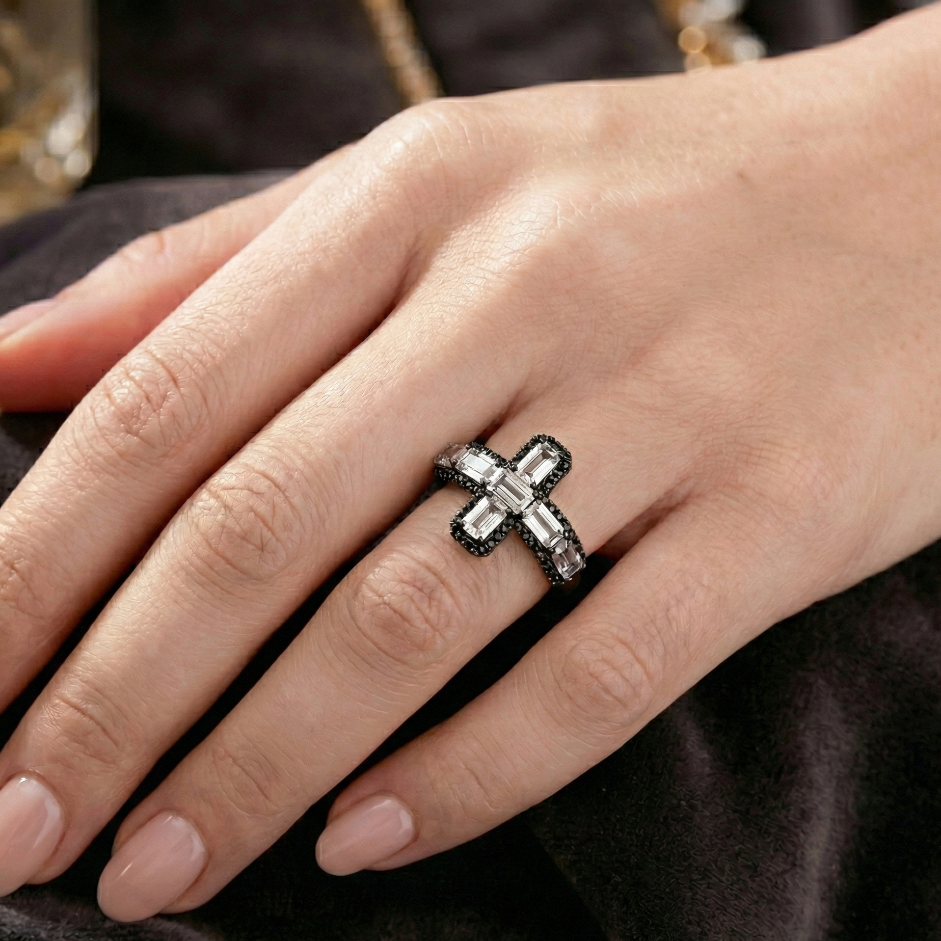 Bague croix en quartz cristal et diamants noirs avec rhodium noir