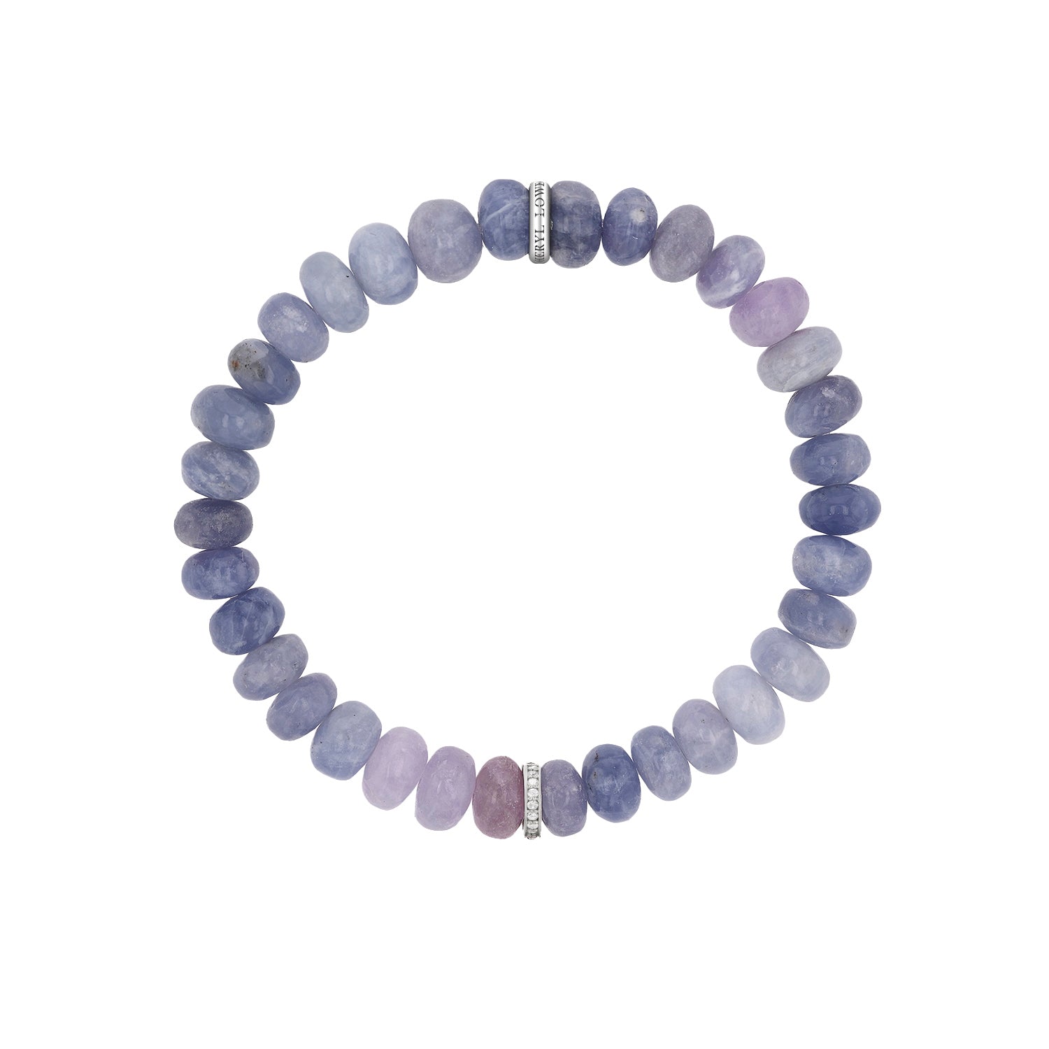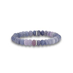 Violet and pink hued hackmanite gemstones are paired with a single sparkling pave diamond and sterling silver rondelle. Hand strung with 8mm smooth round rondelles, the slip-on style bracelet has an inner circumference of 6 ¼ inches. Handcrafted in California. Style number: B0004216.