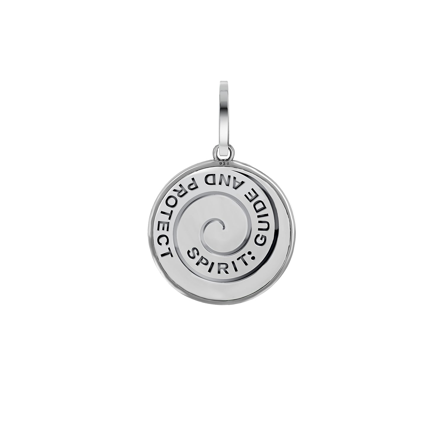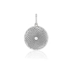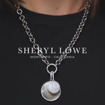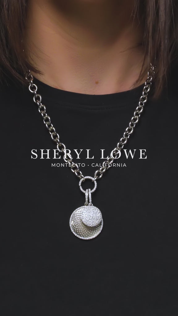The Flow & Light Necklace pairs a sculptural torus pendant with a diamond charm, symbolizing the continuous flow of energy in the universe and the light that is within. Sterling silver necklace featuring two distinctive pendants: a 29mm torus and a 15mm diamond charm, both set with diamonds totaling approximately 1.98 carats. The 18-inch cable chain is crafted from 8mm sterling silver links and secured with a diamond-accented donut hinge clasp at the front. Designed in California.