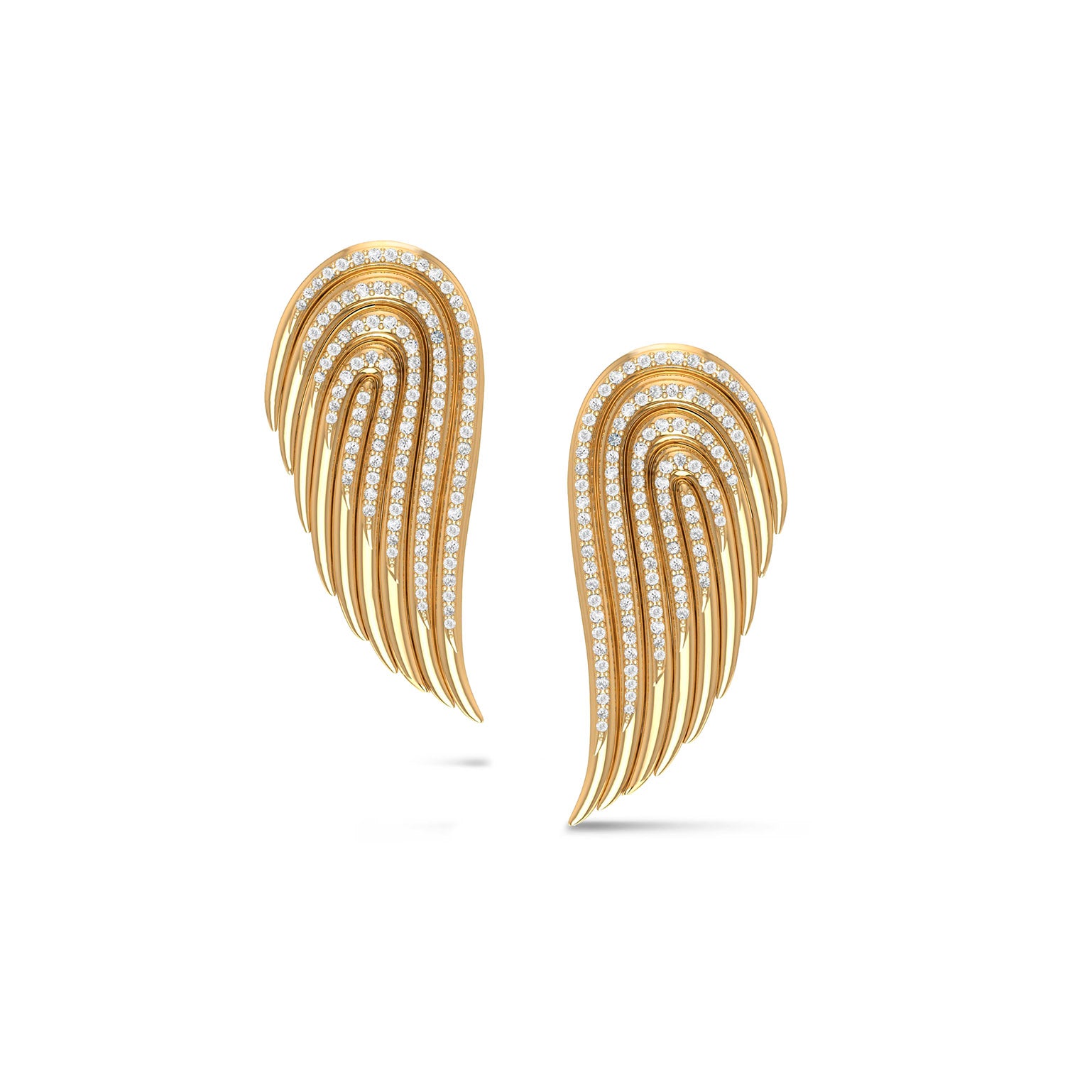 A powerful symbol, these diamond statement earrings are inspired by Nike the winged goddess of Victory. Fashioned in solid 14k gold they are designed to ignite a feeling of power in their wearer.