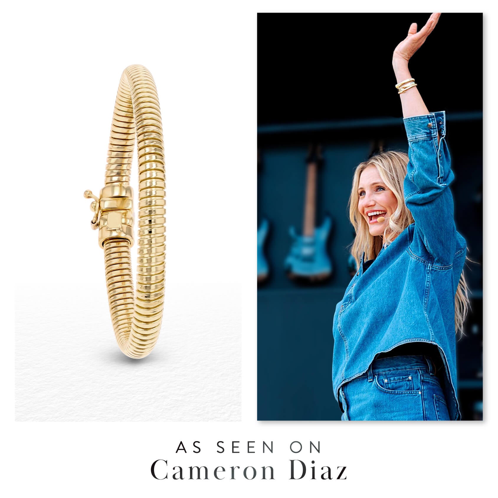 *Cameron Diaz pairs her Skinny Gold Tubogas bracelet with her Chunky Gold Tubogas bracelet at the Bottle Rock Festival.