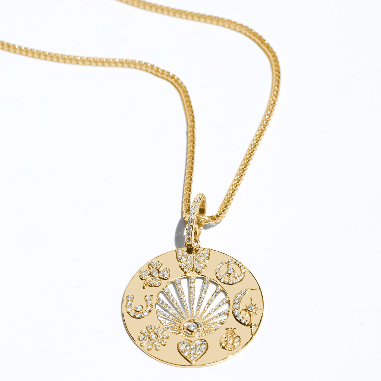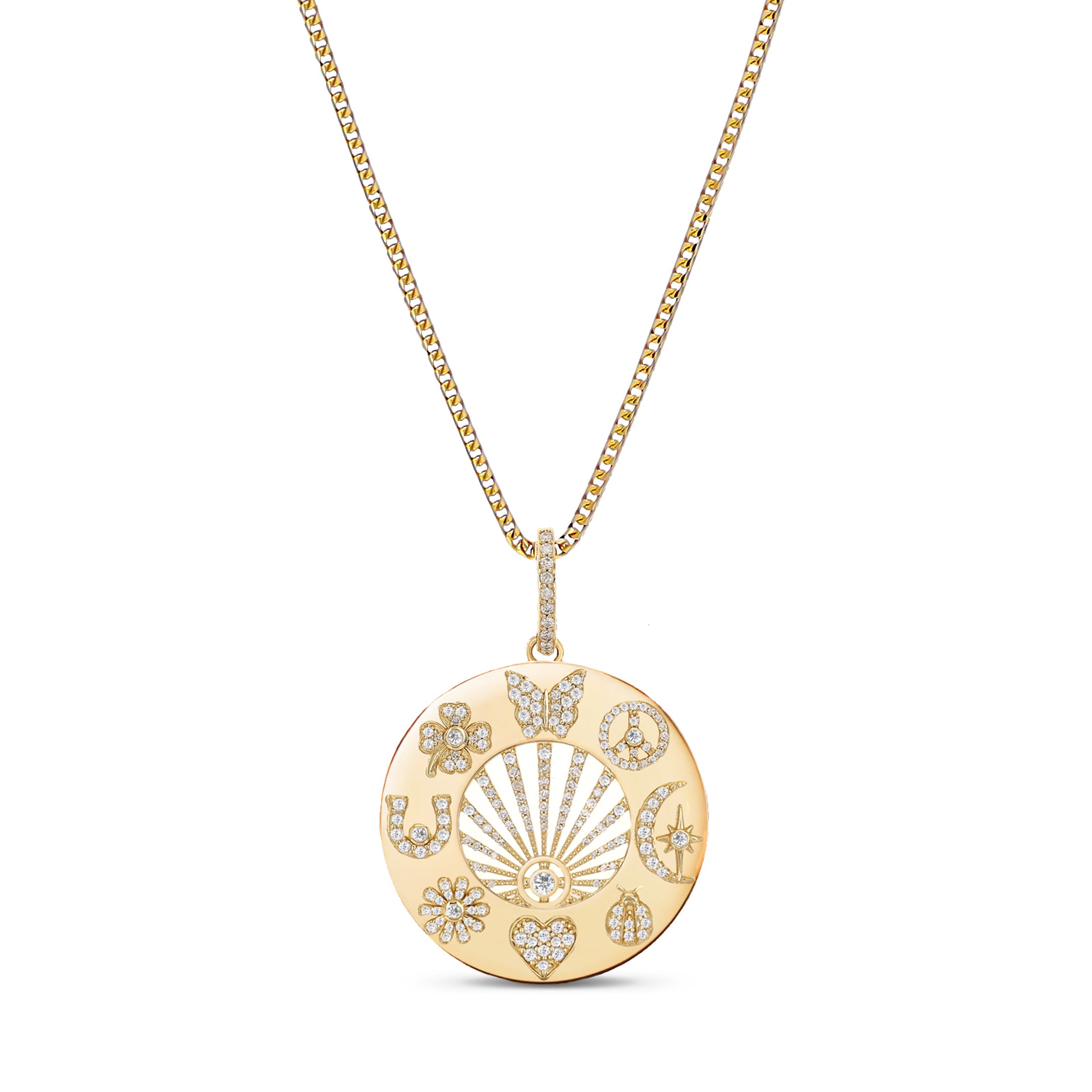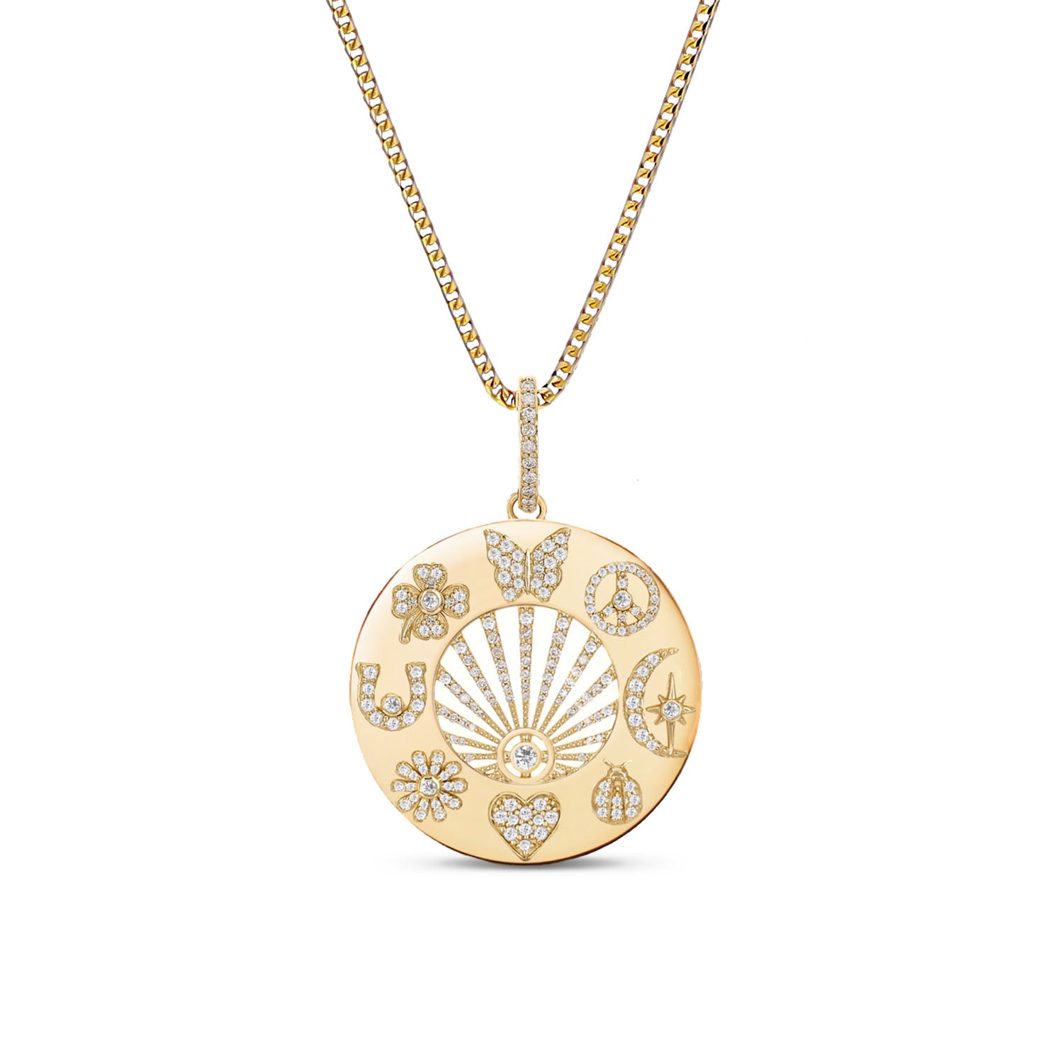 Inspired by all my female heroes who have led the way in manifesting love, serenity, independence, divine guidance, faith and luck I designed this medallion as a talisman that empowers women to manifest their destiny. Butterfly, peace sign, crescent moon, lovebug, heart, daisy, horseshoe and 4 leaf clover come together to remind the wearer to manifest and embody all of these qualities.