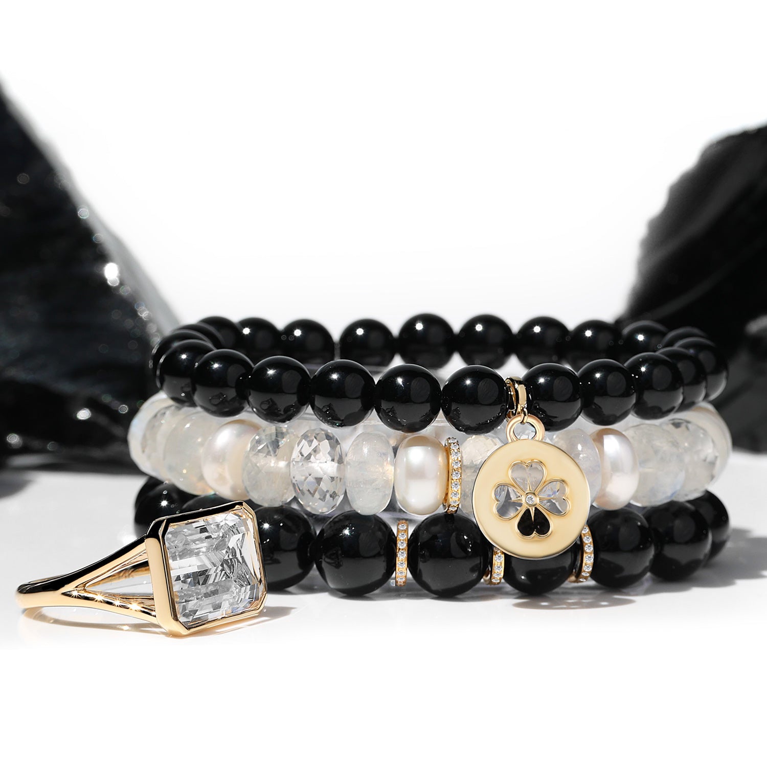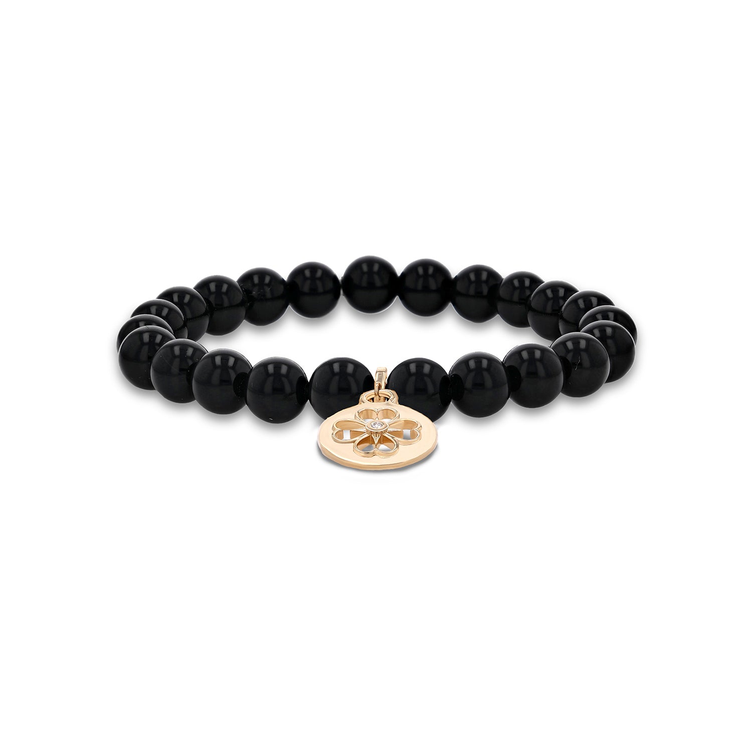 14k Onyx Bracelet with Cut Out Clover Charm - 8mm