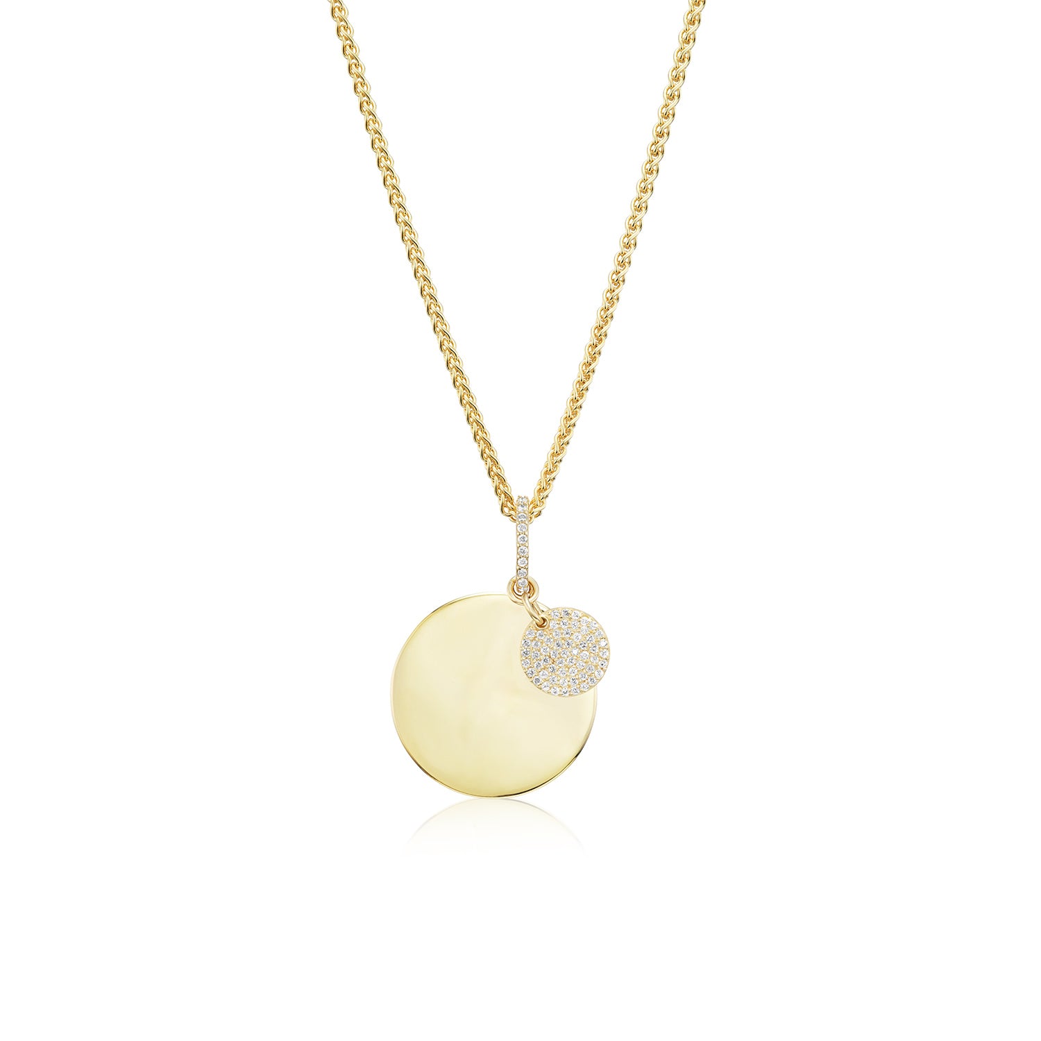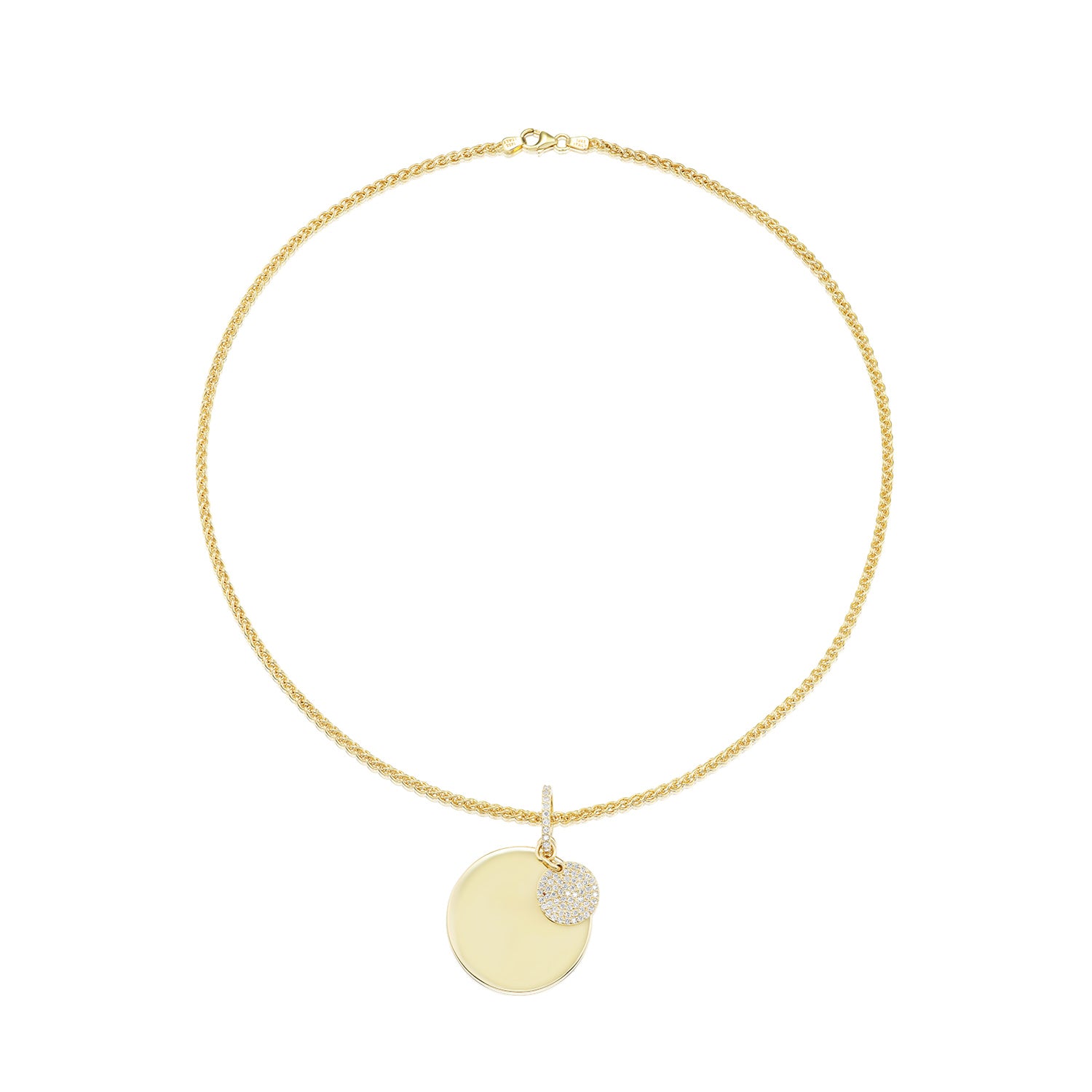 - Large round medallion pendant diameter: 30mm; attached small diamond disc charm diameter: 13mm
