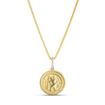 St. Christopher is known as the patron saint of travelers, and you can feel guided and protected whenever you wear this 14K Gold St. Christopher Protect Us Pendant necklace. This substantial pendant features a hand designed image of St. Christopher accented with white diamonds, this pendant is sure to become a treasured keepsake. The pendant securely dangles from your choice of a 30-inch gold snake or franco style necklace chain.