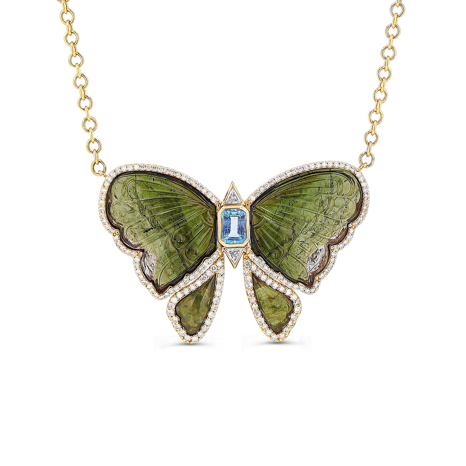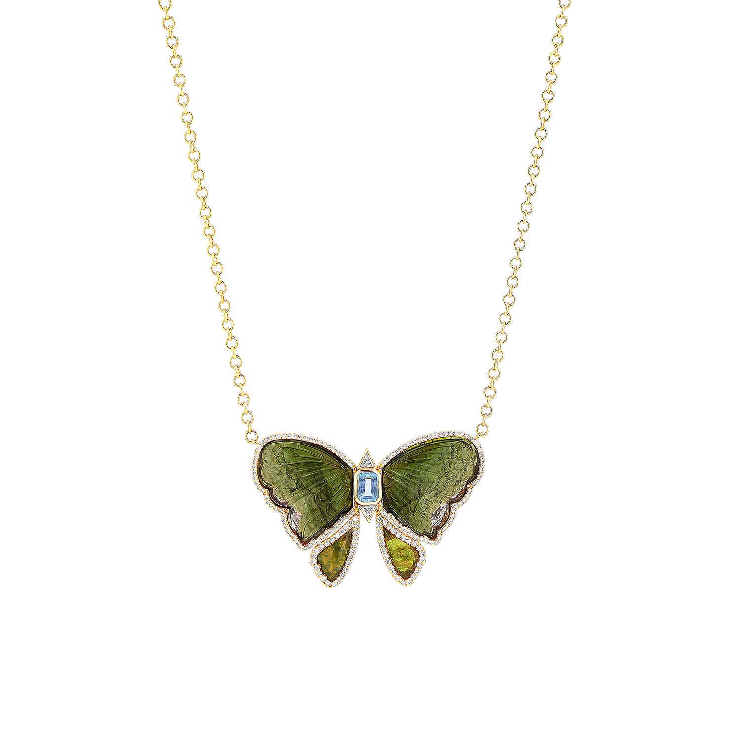 14k Tourmaline, Garnet, Aquamarine & Diamond Butterfly on Cable Chain - One of a Kind
