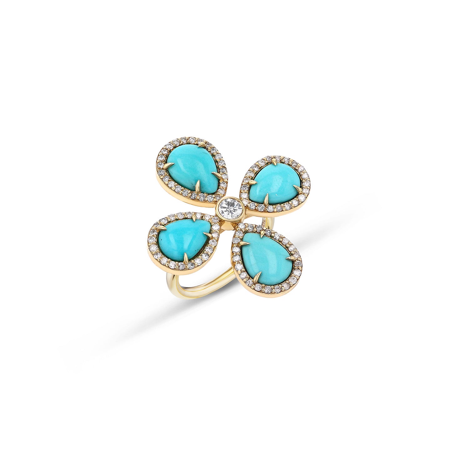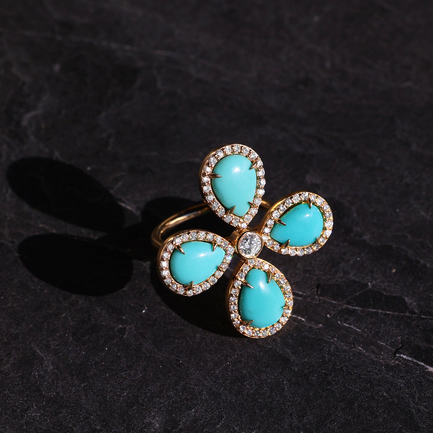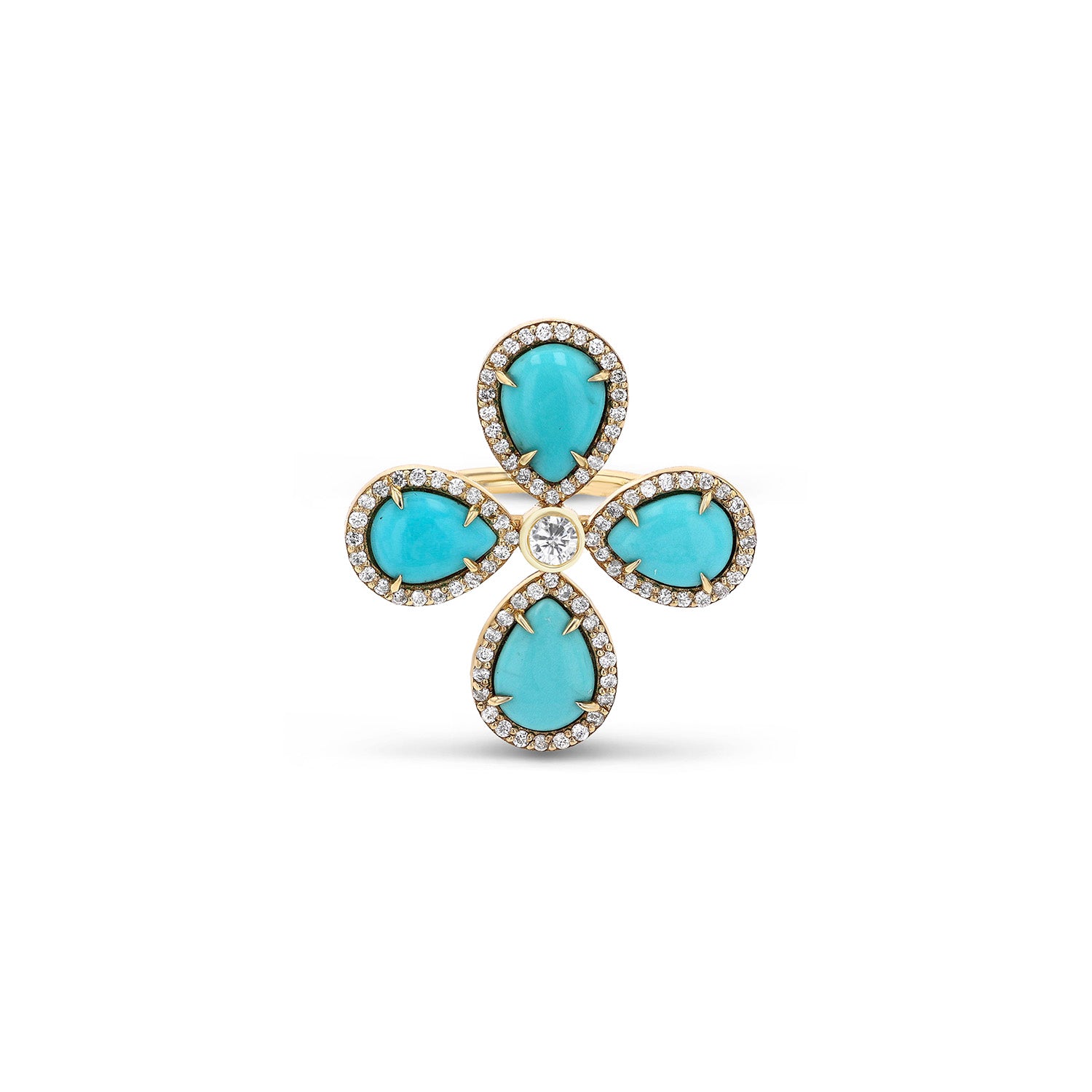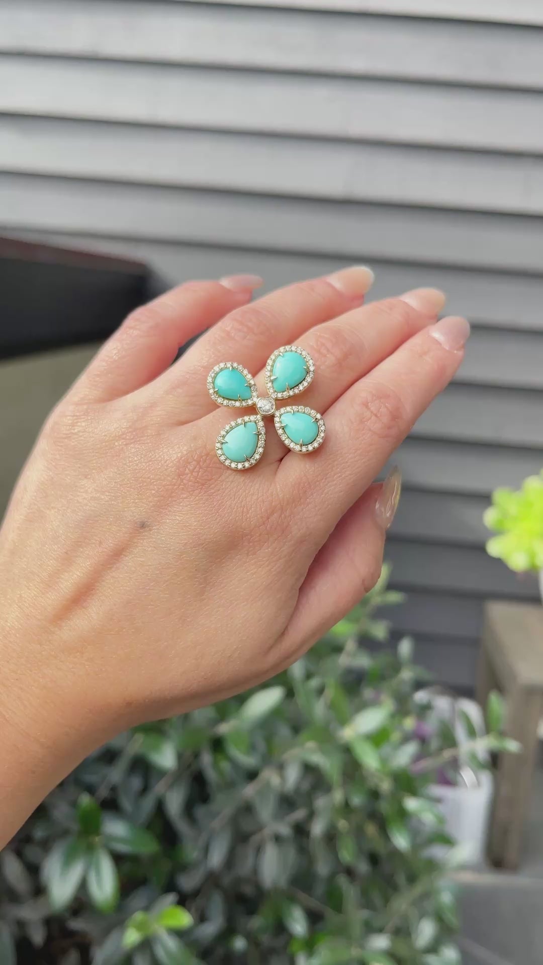 14k Turquoise Cross Ring with Diamond Halo & Diamond Bezel Center - One of a Kind