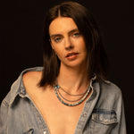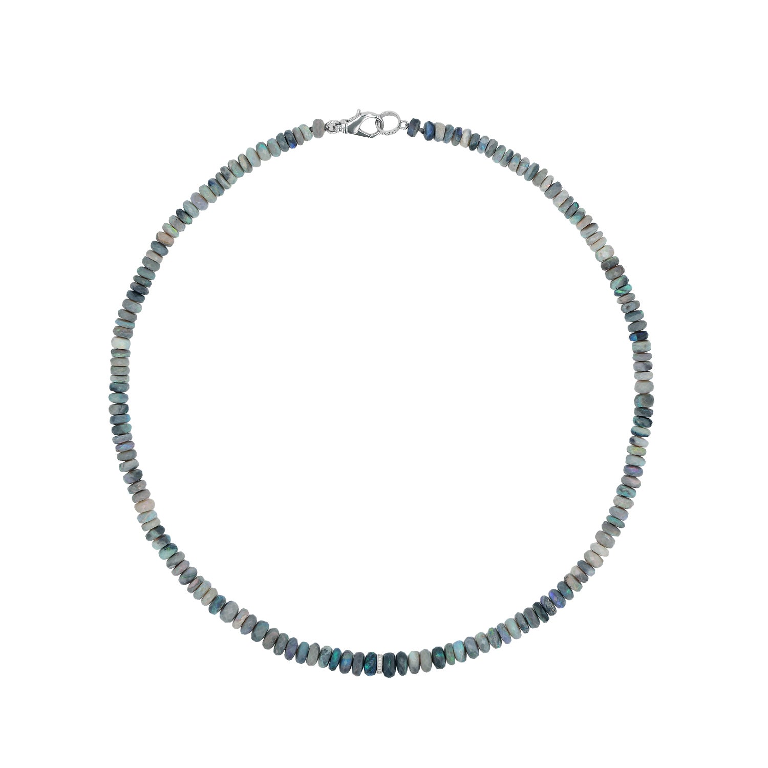 This hand-strung beaded necklace features 6mm to 8mm luminous blue and gray faceted Australian opal beads paired with a single 0.05 carat diamond rondelle accent bead. Necklace closure is a sterling silver lobster claw clasp. With its 20" length, this necklace is designed to be stacked or worn solo. Handmade in California. Style number: N0003794