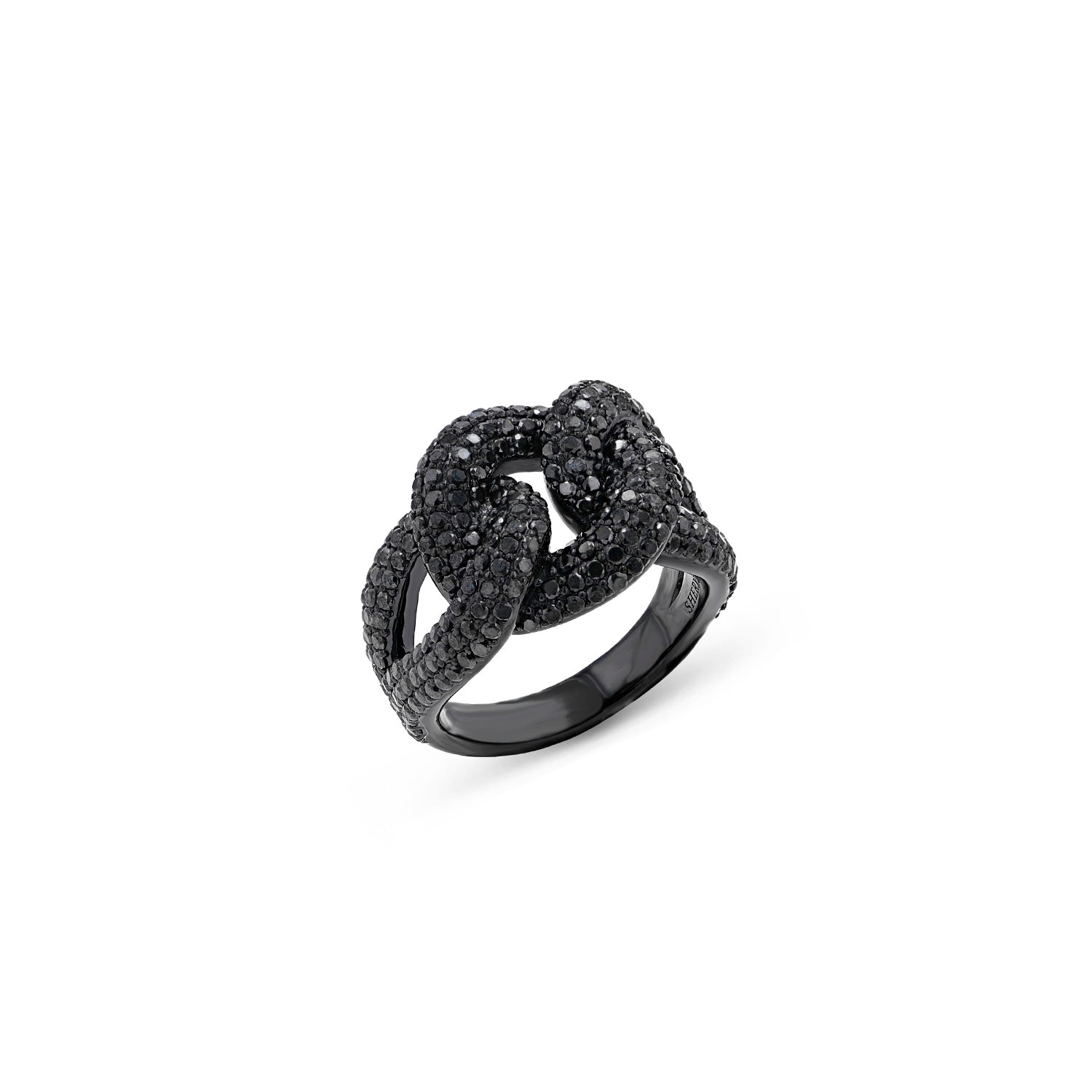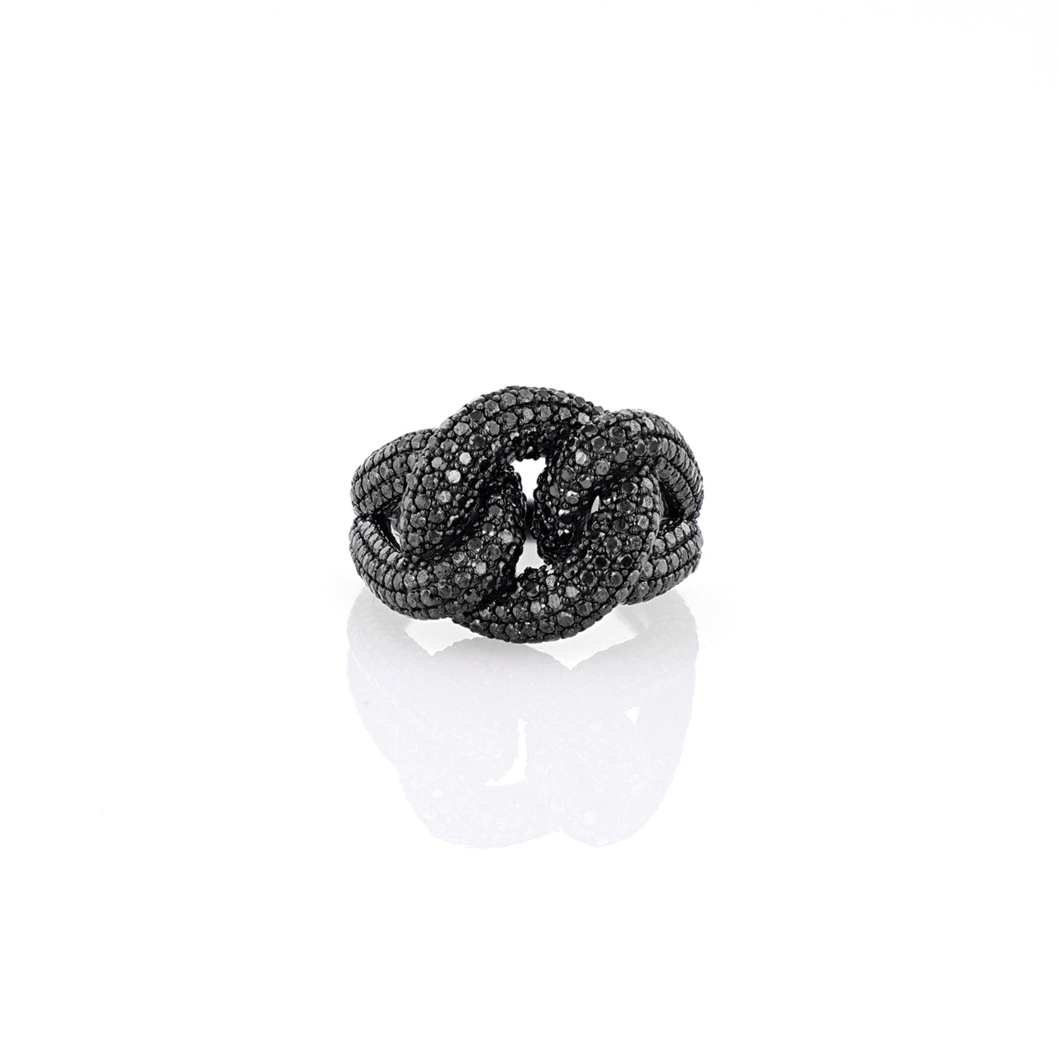 Black rhodium sterling silver and black diamonds come together in a classic mariner knot ring representing love and interconnection.