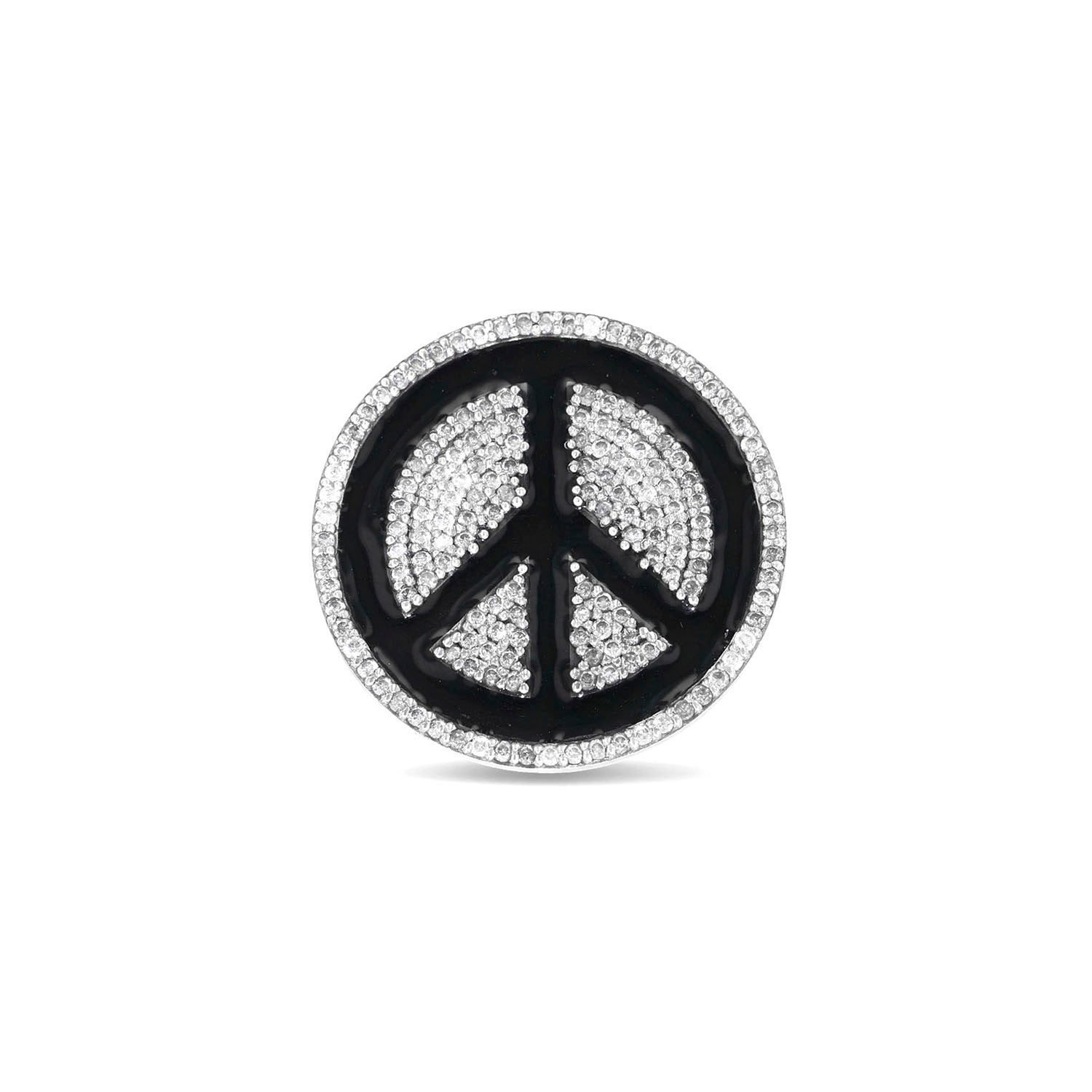Worn as a brooch or as a lapel pin, this piece elevates the classic rocker peace symbol with pavé diamonds.