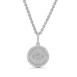 The Silver and Diamond Round Evil Eye Pendant dazzles with its diamond cobblestone Evil Eye symbol and center bezel diamond. A sparkling pave diamond border and bale add a touch more elegance. This Evil Eye Pendant Medallion will elevate any outfit and serve as a powerful talisman and protective symbol. Also sold as a complete necklace.