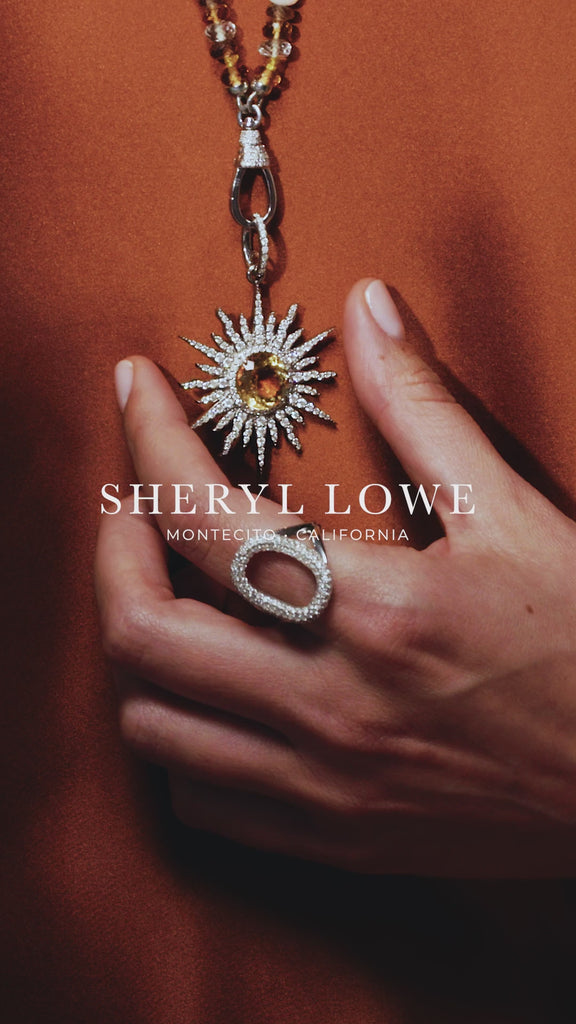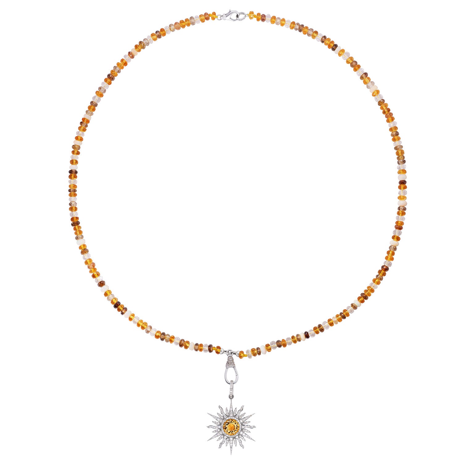 A luminous pendant necklace features a diamond sun pendant with a radiant citrine center stone suspended by a diamond swivel clasp and a stand of faceted brown zircon, crystal quartz, and white Ethiopian opal rondelle beads meant to capture the beauty of golden hour in the South of France. Approximately 2.36 carats of diamonds accent the design. Hand-strung with 6mm faceted beads, this 32" piece secures with both a back lobster claw clasp and diamond swivel front closure. Designed and handmade in California.