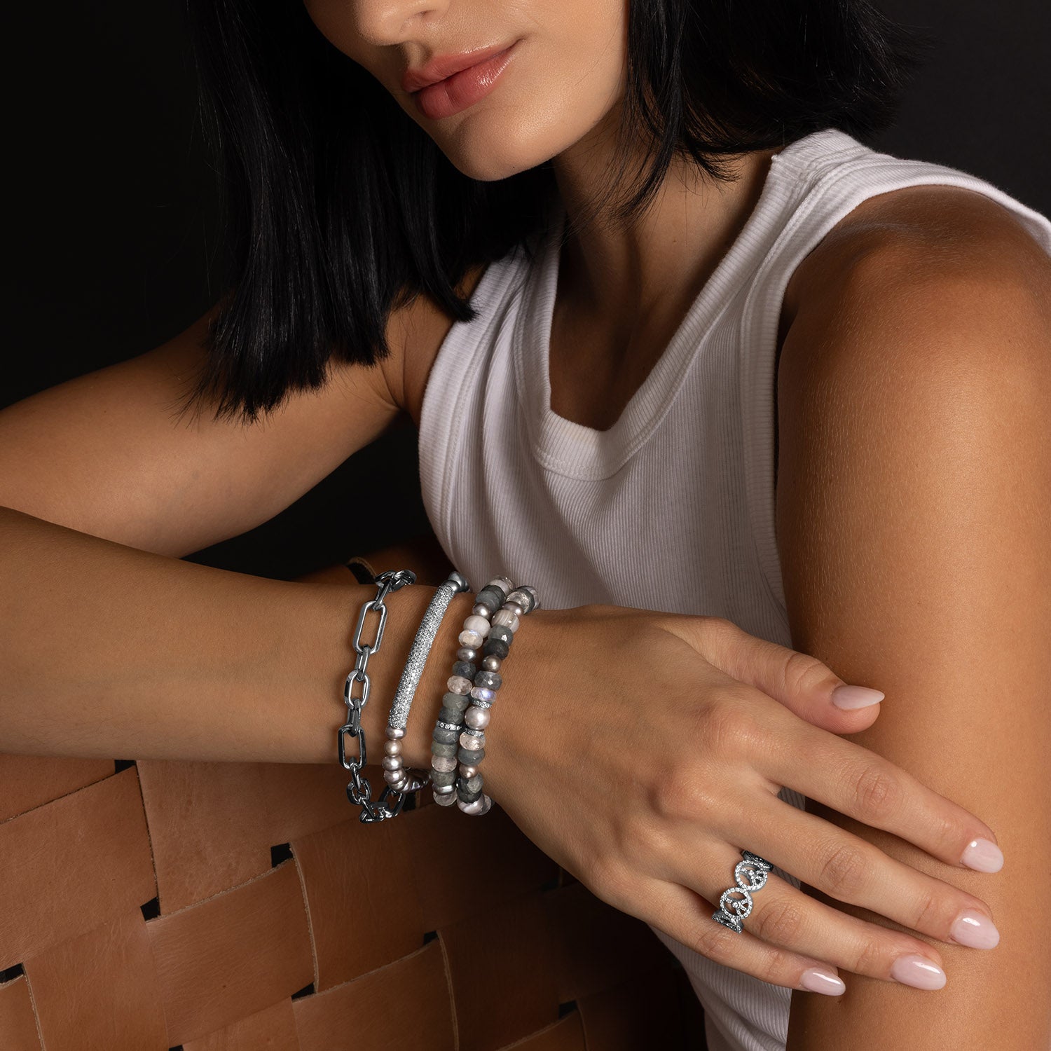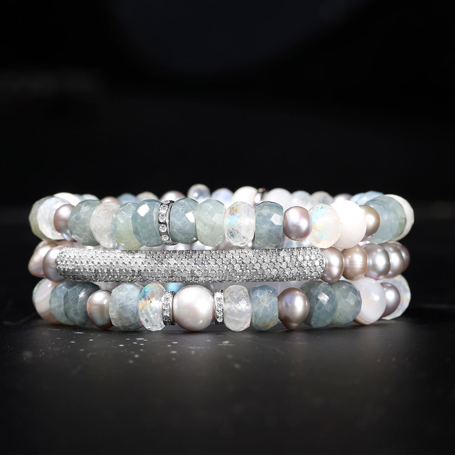 - Matte white lace agate, freshwater pearl, rainbow moonstone, gray sapphire; diamonds, approximately 0.13 carats