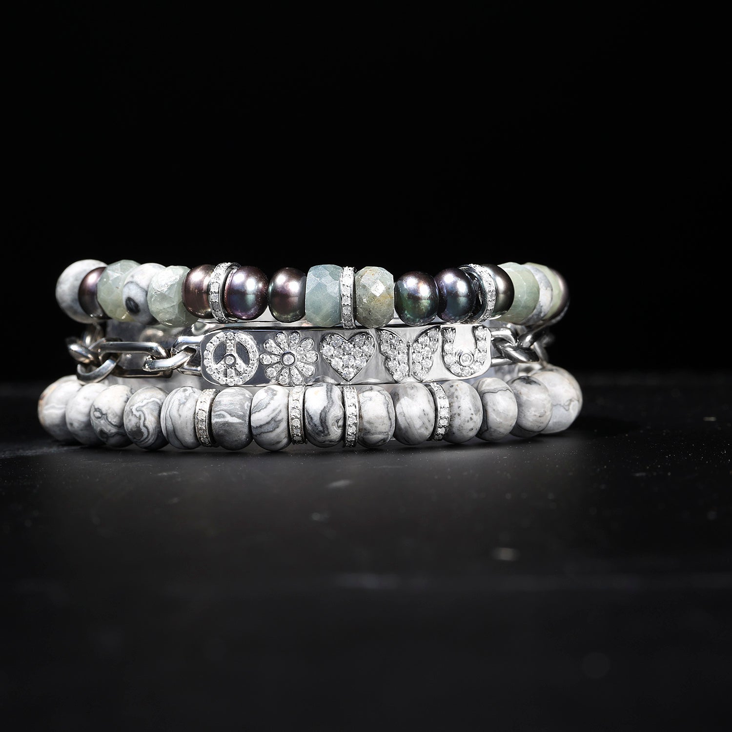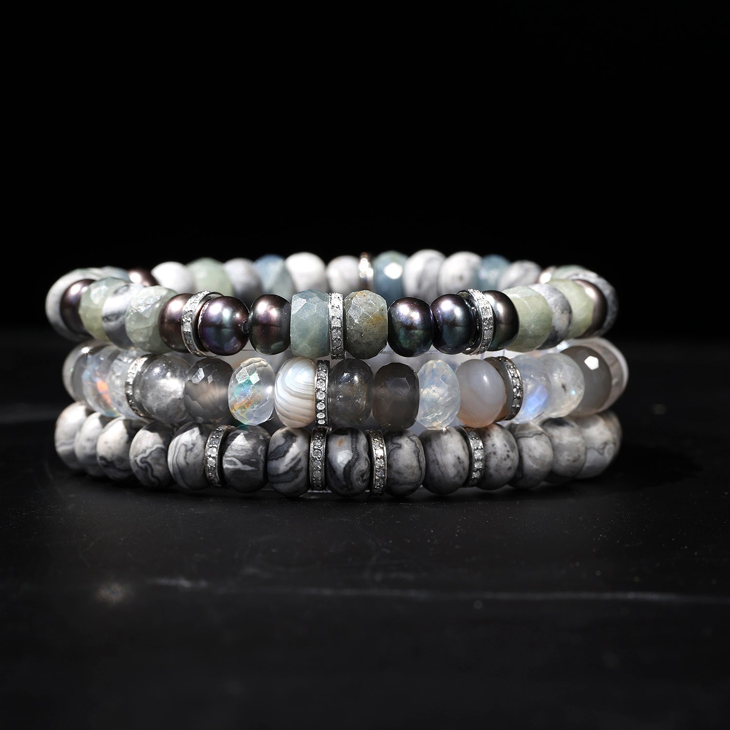 Graphite Gemstone and Pearl Mix Bracelet with Diamond Rondelles - 8mm