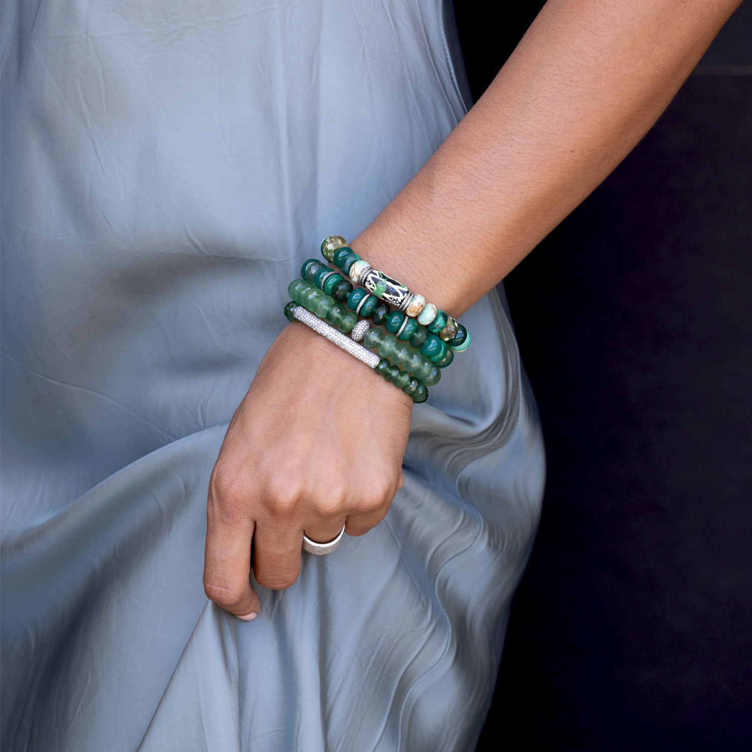 Green Mix Bead Bracelet with Diamond Rondelles - 10mm