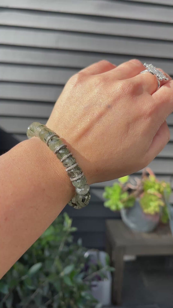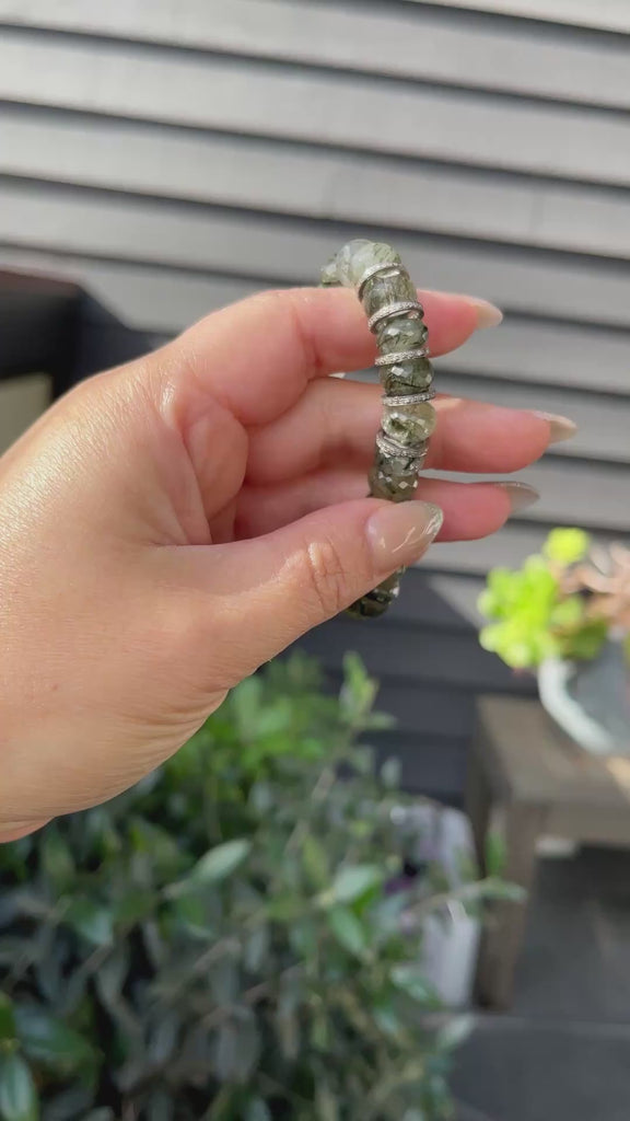 Green Rutile Quartz Bracelet with 5 Diamond Rondelles - 10mm