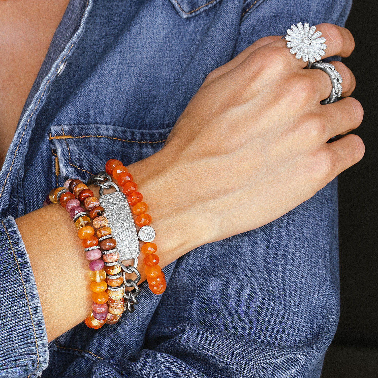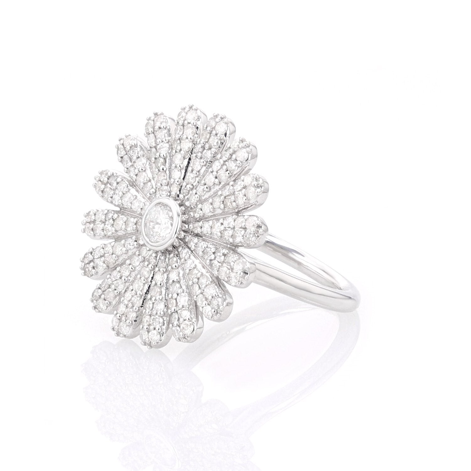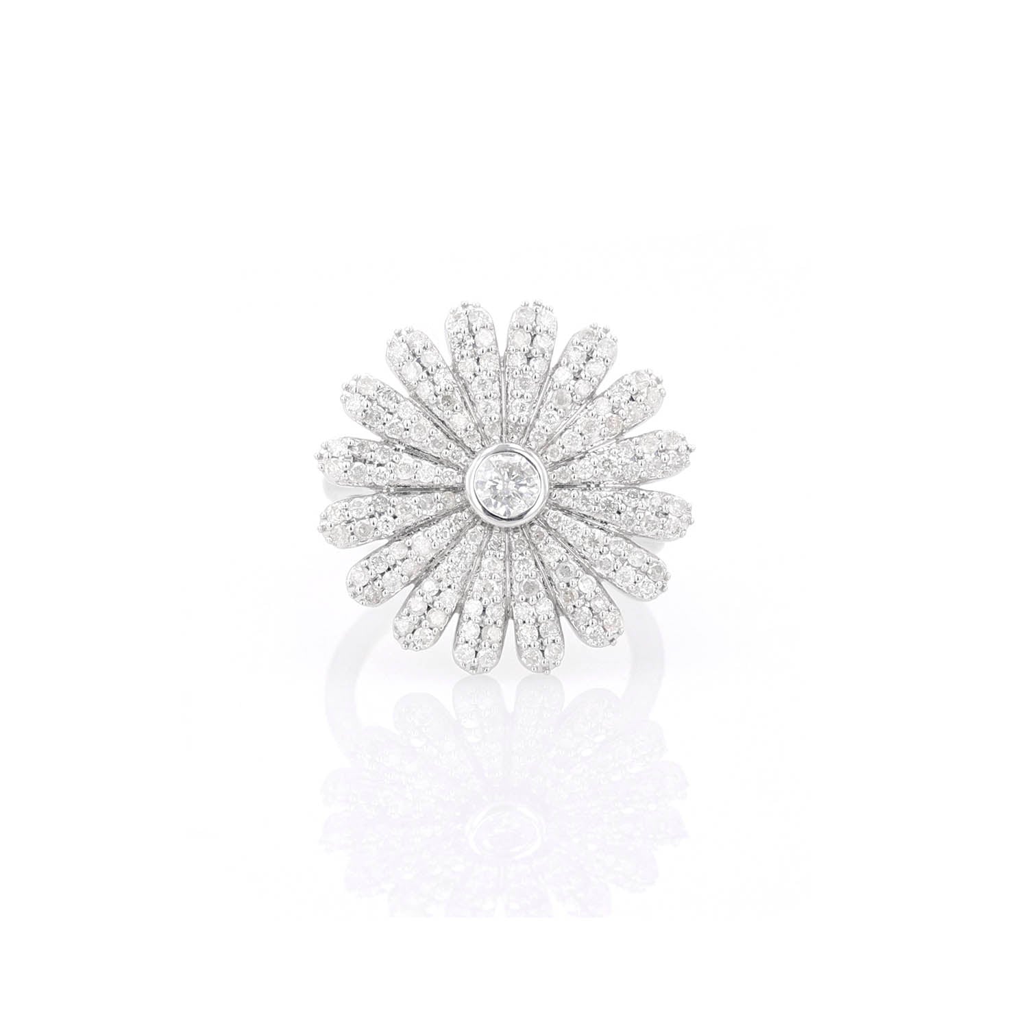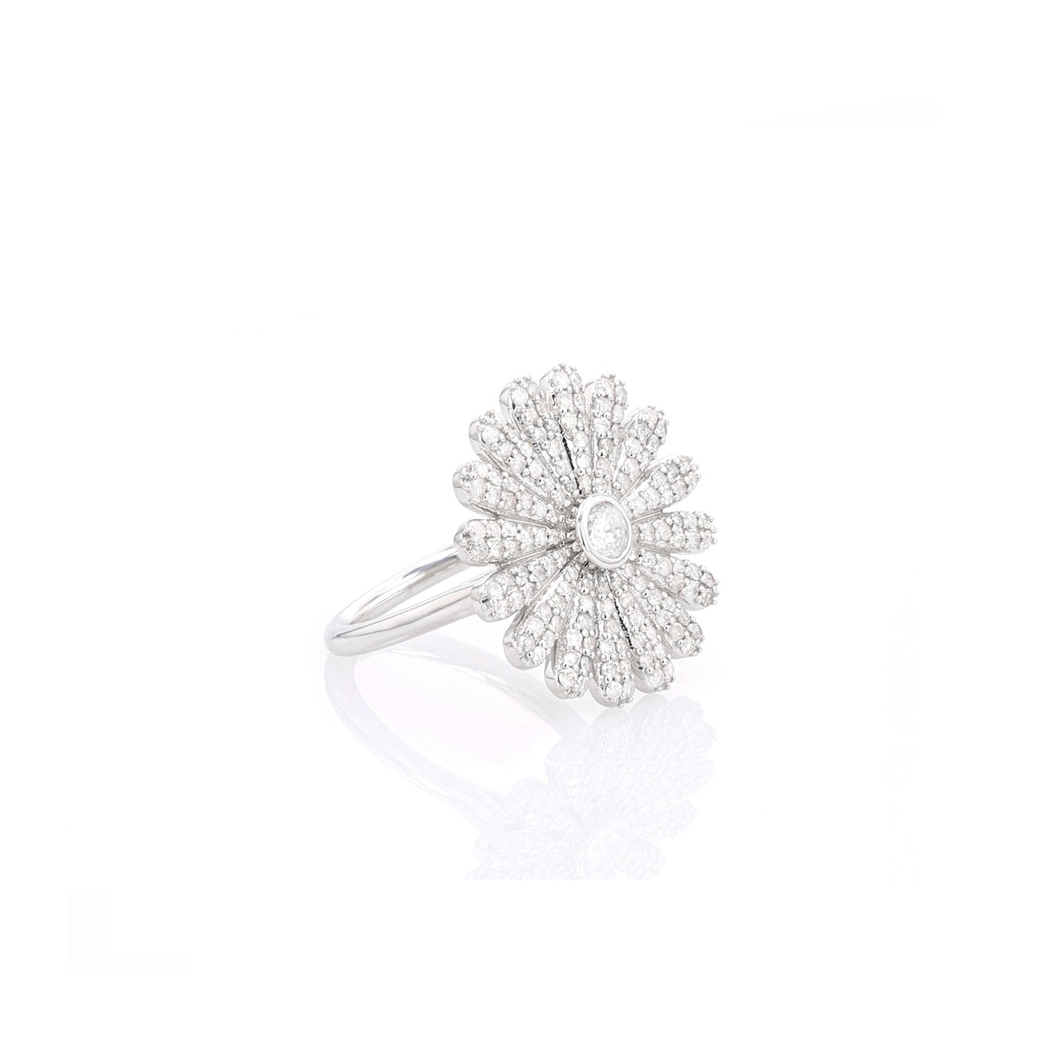 The large silver daisy flower ring is handcrafted in sterling silver and features a bezel diamond at the center from which extends pave diamond covered daisy petals.