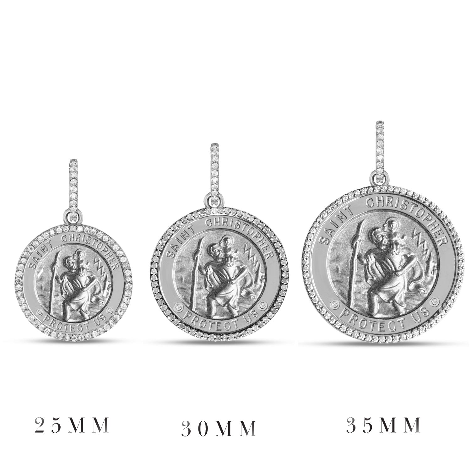 The Sterling Silver St. Christopher Medallion pendant with diamond border and diamond bail is available in 3 sizes: 25mm, 30mm and 35mm and can be purchased with the 18 inch sterling silver Franco chain or can be purchased without a chain.