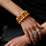 Three beaded bracelets layer in a warm, golden palette, bringing together luminous South Sea pearls with citrine, fire opal, yellow quartz, and golden rutilated quartz. Smooth and faceted rondelle beads mingle with both hand-faceted and round pearls ranging from 10mm to 14mm, creating soft movement and natural variation along the wrist.
